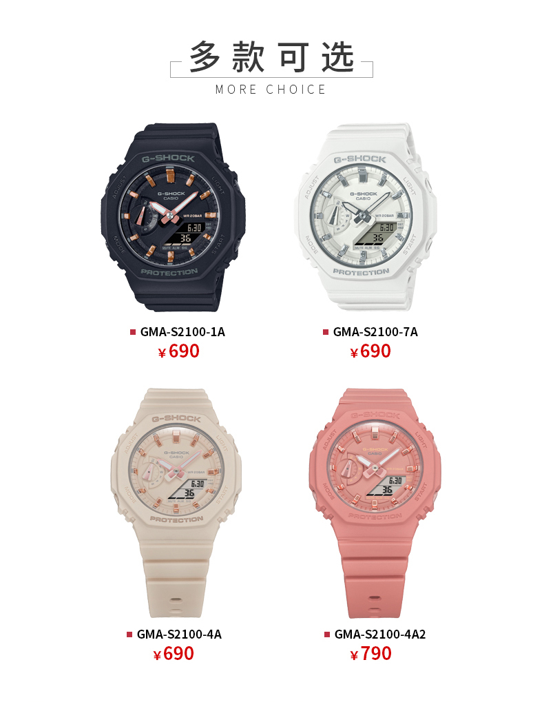 沿用G-SHOCK的潮流设计,融入到更小尺寸表款,适合女性佩戴;八角形表盘设计,符合时下追求复古的潮流文化。并采用中性的色彩表达,基础款配色和金属元素结合,将时尚优雅和休闲风格平衡。四款配色可选,彰显独特且个性。
